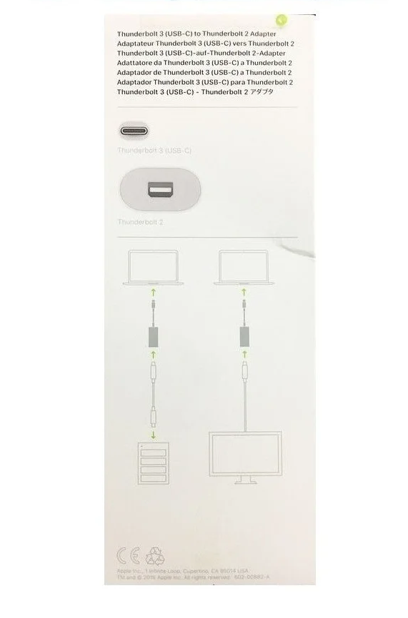 El adaptador Thunderbolt 3 a Thunderbolt 2 de Apple convierte un puerto Thunderbolt 3 en un sistema a un puerto Thunderbolt 2, permitiéndole usar dispositivos de la generación anterior en su nueva computadora Thunderbolt 3. Este adaptador es compatible con unidades de almacenamiento externo, así como pantallas. Con un diseño bidireccional, puede conectar un dispositivo móvil Thunderbolt 3 a una computadora Thunderbolt 2, usando un cable opcional Thunderbolt 2. Además, Thunderbolt 3 es una interfaz de hardware que utiliza un conector USB-C, que ofrece un diseño reversible.