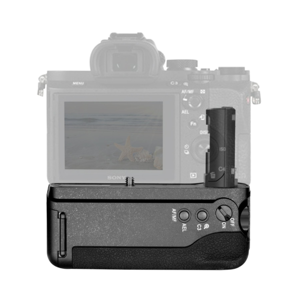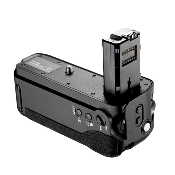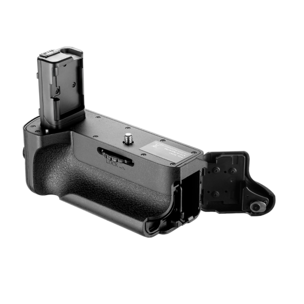 La empuñadura de batería de liberación rápida puede contener 1 o 2 piezas de respaldo de batería NP-FW50, duplicando la capacidad de la batería para obtener más tiempo de disparo.