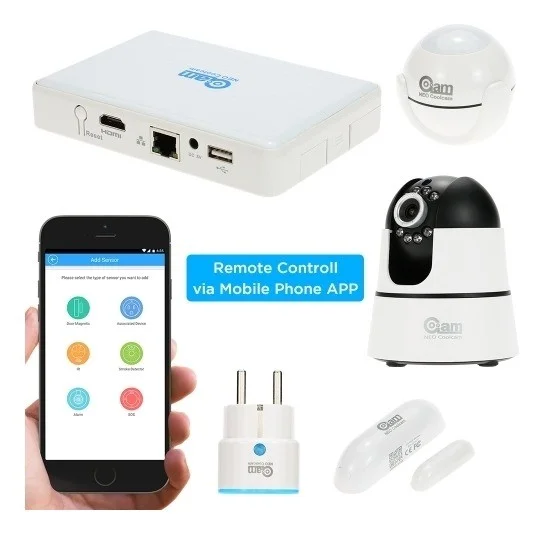 El producto IHOME KITS es una tecnología nueva. Hay un Host de alarma que también puede ser un Grabador de video de red NVR, y tiene sensores, sensor PIR, contacto de ventana, Smart Socket. Además, tiene una cámara IP HD.