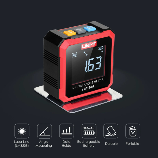 LM320A es un medidor digital profesional de cubeta angular, buscador de ángulos de UNI-T, una herramienta de nivel resistente y resistente básicamente diseñada para industrias, fabricación, construcción.