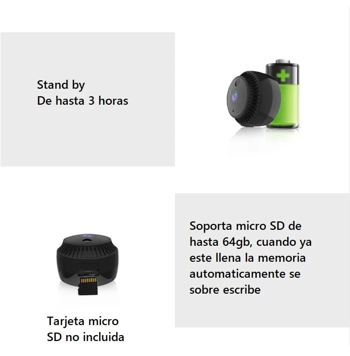 WIFI. Tarjeta TF: Tarjeta de soporte máximo 64G TF (no incluida).Enlace inteligente para wifi:720p Full HD.Sensor 720P actualizado recientemente millones de píxeles para mejorar su experiencia visual. Monitoreo remoto móvil. No importa dónde se encuentre, siempre que su teléfono móvil tenga una red. Usted puede monitorear de manera remota y mantener su hogar seguro. HD Night Vision.Luces de visión nocturna invisibles LED. El monitoreo no es fácil de detectar, puede ser claramente visible sin una fuente de luz. Detección de movimiento. Cuando aparece un objeto en movimiento en el rango de monitoreo. La cámara enviará inmediatamente el mensaje de alarma a la aplicación del teléfono móvil. La función de detección de movimiento se puede activar / desactivar a través de la aplicación. Gran angular de 150 ° Gran angular de 150 °, amplio campo de visión. Mejor efecto visual, y vista sin obstáculos de la casa. Larga espera. Batería recargable incorporada, todavía puede permanecer durante mucho tiempo después de apagarla. Grabación de tarjetas.Ranura para tarjeta incorporada del TF, puede soportar hasta 64G. El video se puede almacenar en la tarjeta de memoria para reproducirlo en cualquier momento, en cualquier lugar. El video más antiguo será automáticamente. Cobertura cuando la tarjeta de memoria está llena. Metodo de instalacion Una variedad de métodos de instalación para satisfacer sus diferentes requisitos.