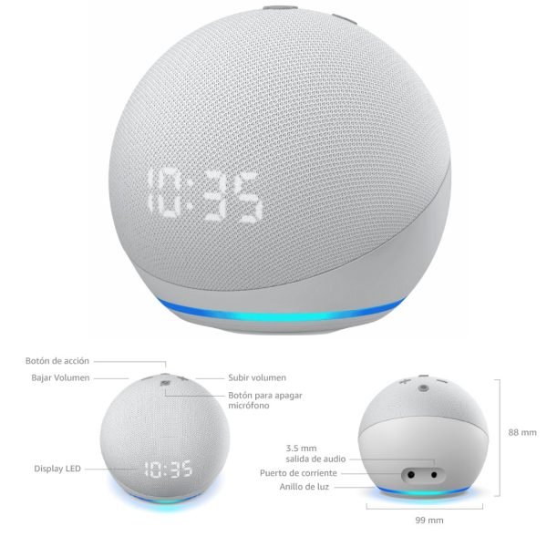 Echo Dot con reloj – Nuestro parlante inteligente más popular con Alexa. Este diseño elegante y compacto ofrece voces nítidas y bajos equilibrados, para un sonido completo.