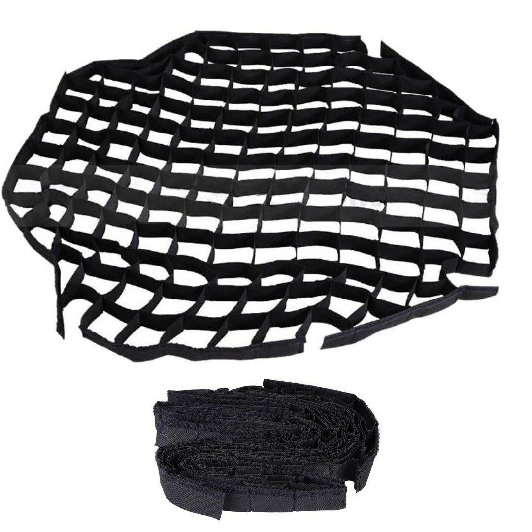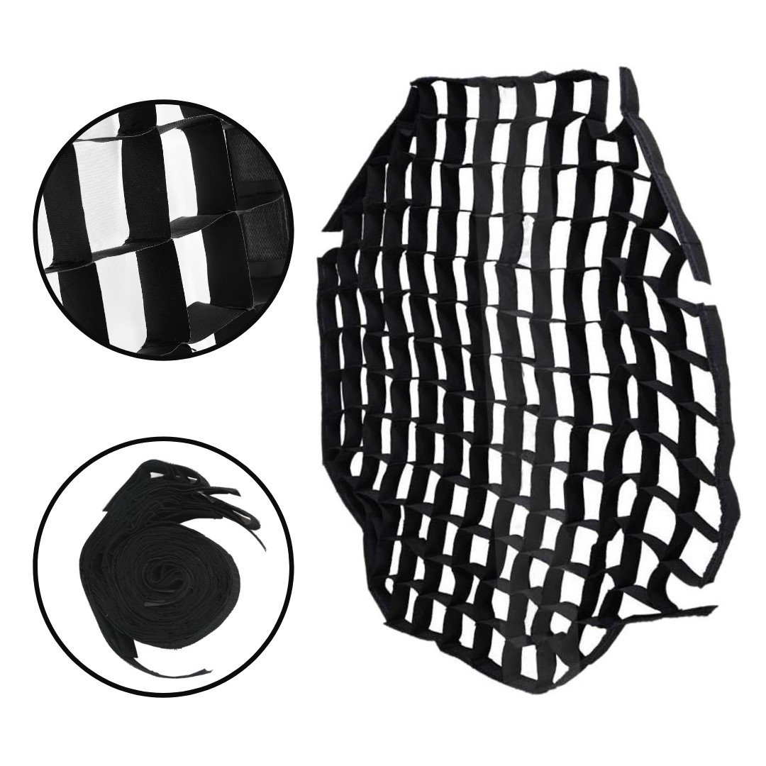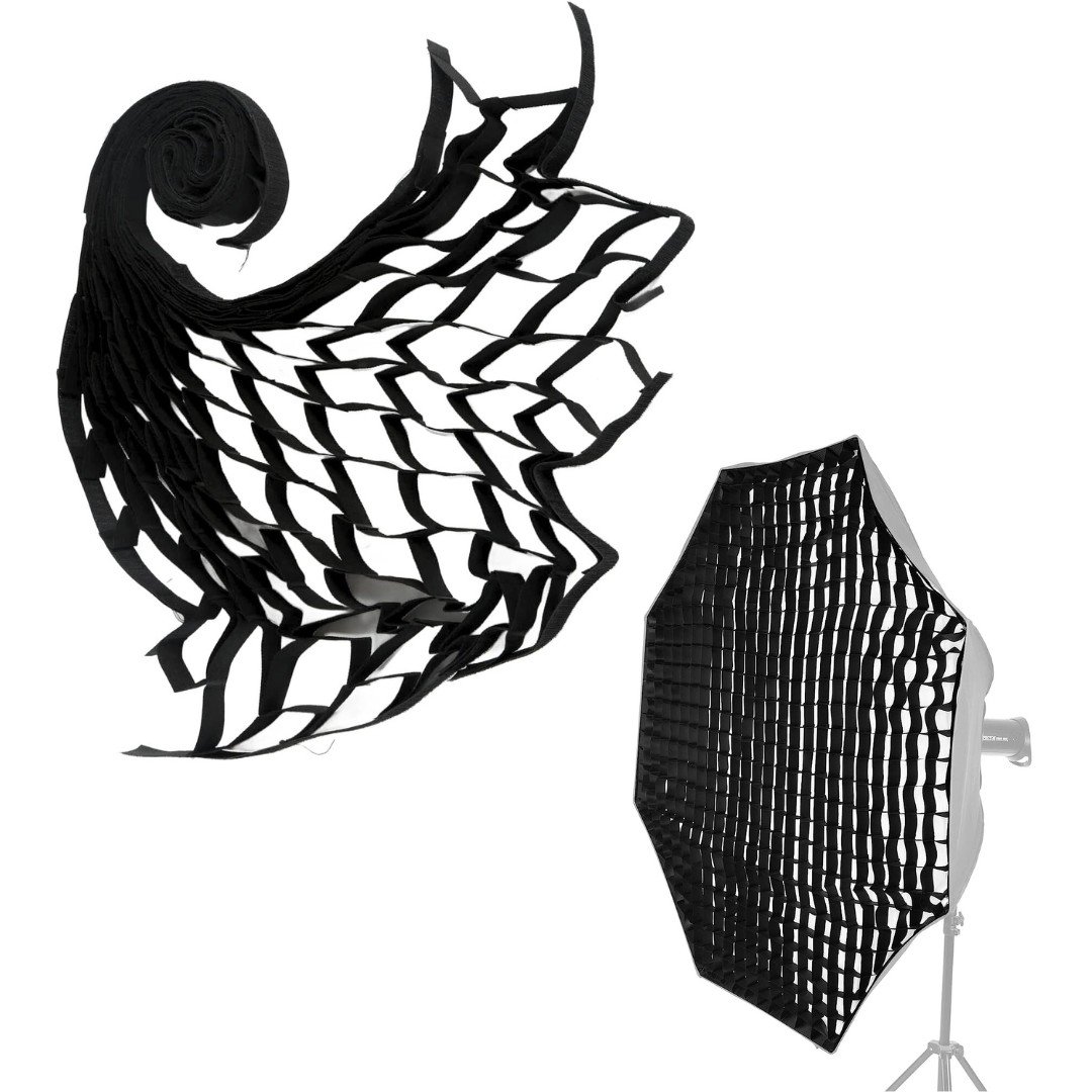 El nido de abeja negro está diseñado para softbox octágono de fotografía de 140 cm/55 pulgadas. Diseño de cierre de bucle, fácil de instalar y quitar de la caja de luz (no incluida).