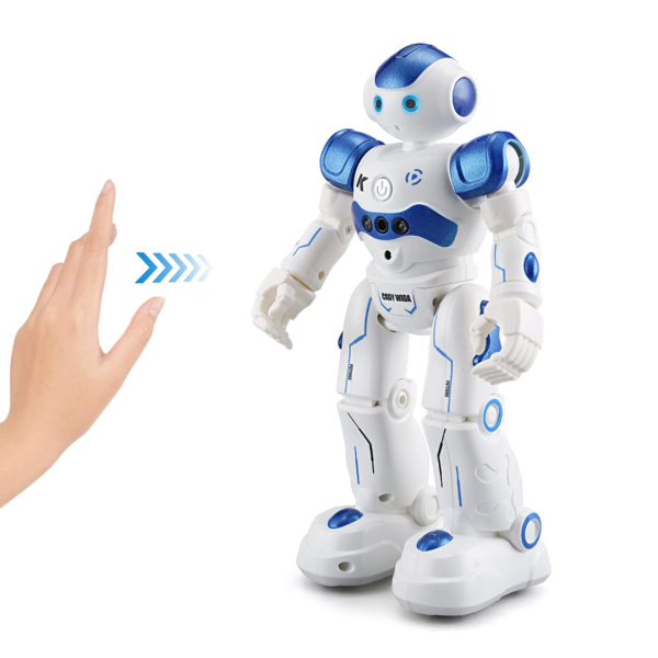Mando a distancia y control por gestos.El robot de detección de gestos no sólo se puede controlar mediante el controlador de infrarrojos, pulsando el botón de modo de seguimiento del mando a distancia, puede controlar el robot para que se mueva hacia delante, hacia atrás, gire a la izquierda y gire a la derecha mediante comandos gestuales, cada acción va acompañada de un efecto de sonido, lo que resulta muy interesante.