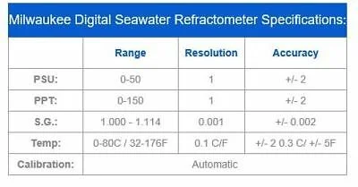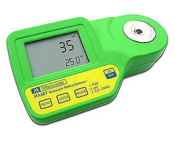 El refractómetro MA887 es un dispositivo óptico que es simple y rápido de usar. Las muestras se miden después de una simple calibración de usuario con agua destilada o desionizada. En segundos, el índice de refracción y la temperatura se miden y se convierten en una de las tres unidades de medida populares; Unidades prácticas de salinidad (PSU), salinidad en partes por mil (ppt) o gravedad específica (SG (20/20)). Todos los algoritmos de conversión se basan en publicaciones científicas respetadas que utilizan las propiedades físicas del agua de mar (no el cloruro de sodio). La temperatura (en ° C o ° F) también se muestra en la pantalla grande de doble nivel junto con los códigos de mensaje útiles.